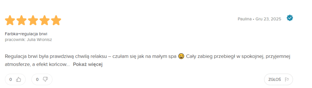 Regulacja brwi była prawdziwą chwilą relaksu – czułam się jak na małym spa 😆 Cały zabieg przebiegł w spokojnej, przyjemnej atmosferze, a efekt końcowy przerósł moje oczekiwania. Brwi wyglądają perfekcyjnie. Zdecydowanie polecam każdemu, kto ceni profesjonalizm i dbałość o detale.⭐
